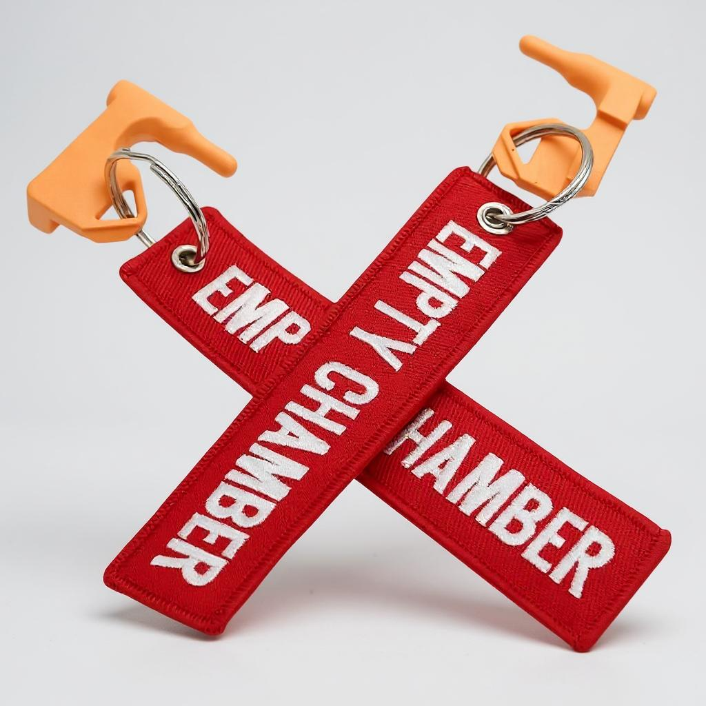 2‑Pack Red Embroidered Firearm Safety Keychain Tags – ‘Empty Chamber’ / ‘Remove Before Firing’ Rifle, Pistol & Shotgun Reminder Flags