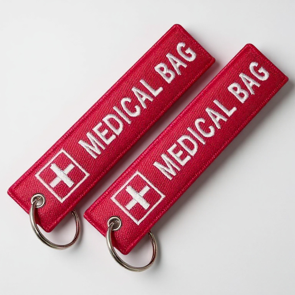 2-Pack Medical Bag Tag Keychains – Double-Sided Embroidered Red Alert Tags for Emergency Identification