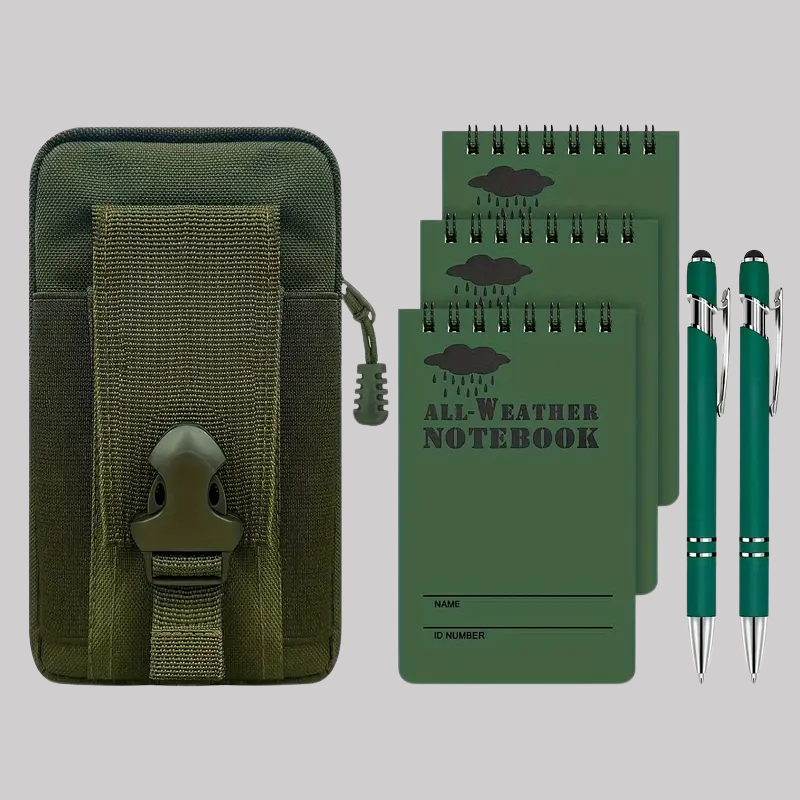 Army Green Waterproof Notebook Set – Outdoor PVC Pouch, Windproof Pen & Durable Notepad for Adventure, Tactical & Field Use