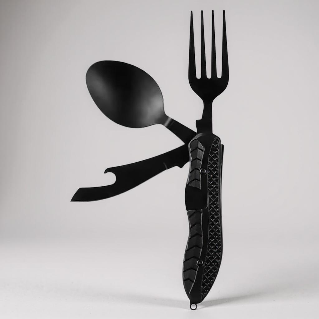 Black 3‑in‑1 Foldable Camping Multi‑Tool – Knife, Spoon & Fork with Integrated Bottle Opener & Comfort Grip
