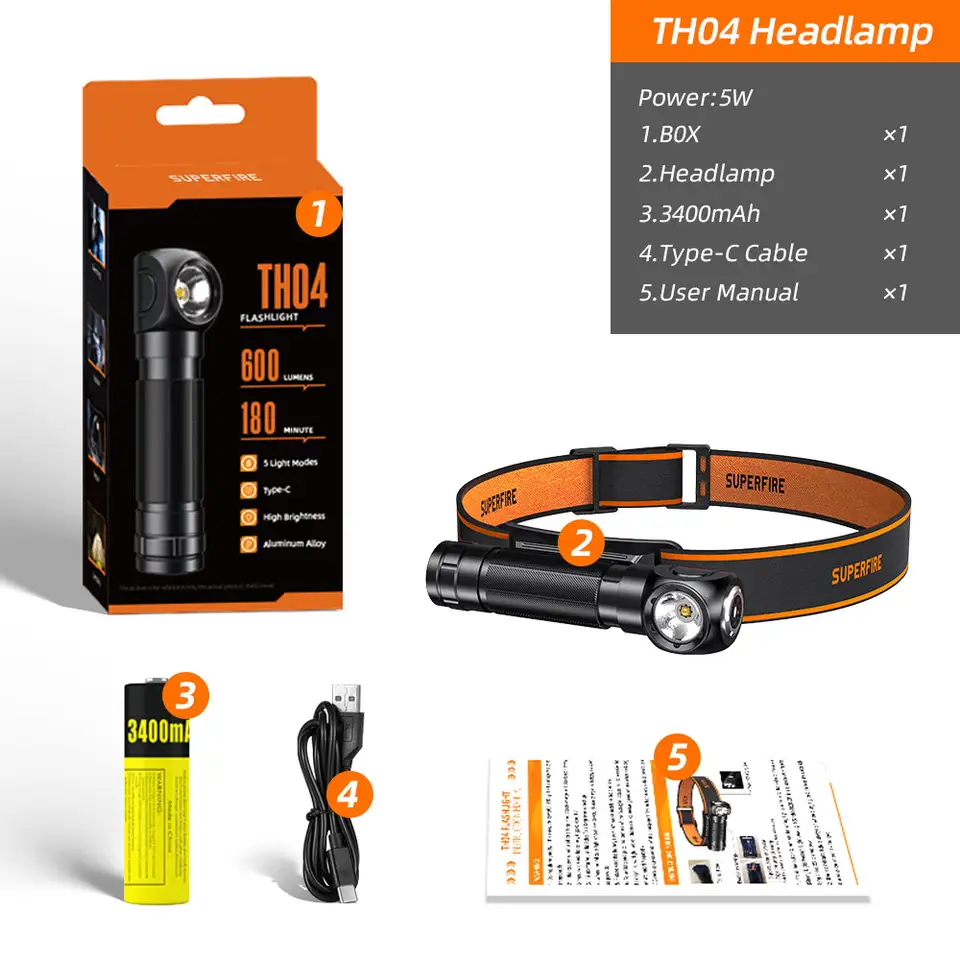 Rechargeable LED Headlamp – Type‑C USB, 90° Adjustable Headlight with Magnetic Tail & 18650 Battery